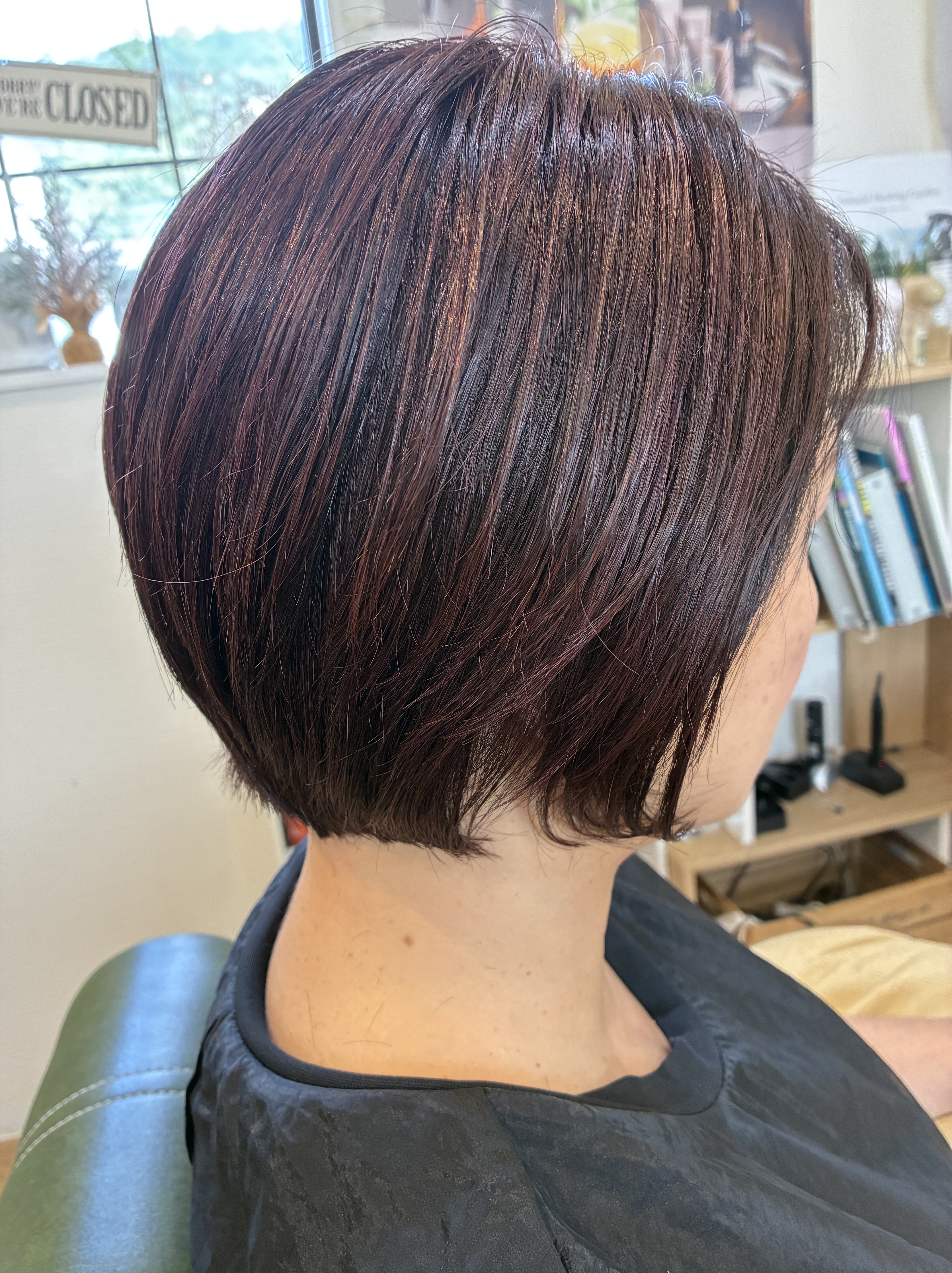 ハイライトを細かく入れたピンクパープル系の**「ワインベリーグロウカラー」**で、大人の艶感を引き立てたショートボブスタイル✨
